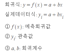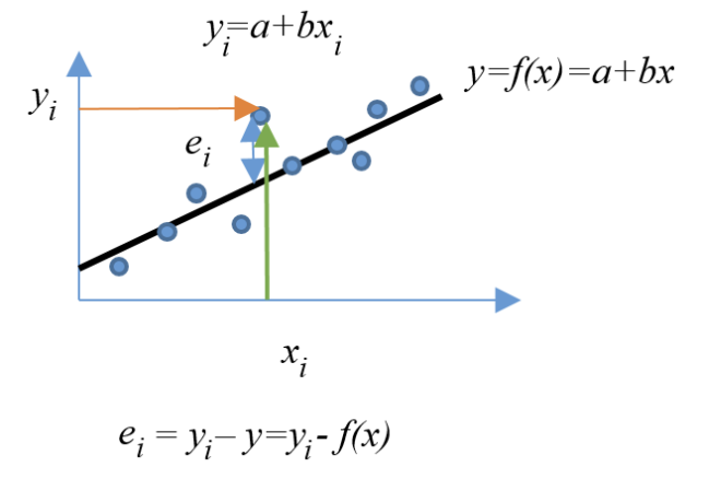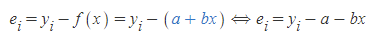최소제곱법은 실제 y의 값과 모델에서 얻은 추정값 a+b(x)_i 사이의 차이인 오차항 e를 이용한다.