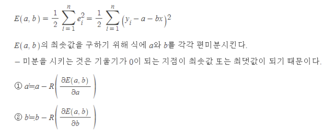 SSE에 계산의 편의를 위한 상수 1/2을 곱하면, 새로운 목적함수 E를 설정할 수 있는데, 이를 활용하여 a와 b에 새로운 의미를 부여할 수 있다.