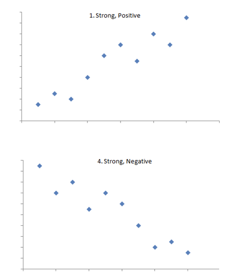 - 음의 산포도: x축의 독립변수가 증가할 때, y축의 종속변수가 비교적 일정하게 감소하는 산포도, 두 변량은 음의 상관관계를 갖는다고 할 수 있다.
