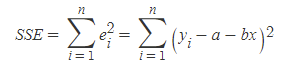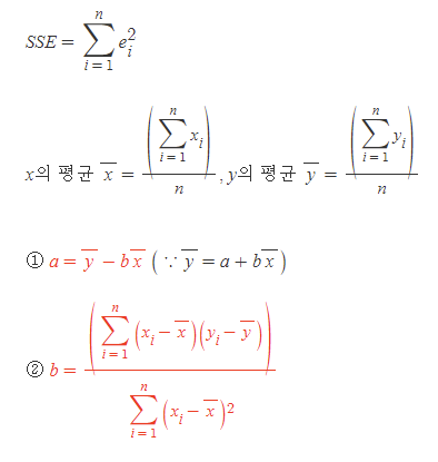 또한 오차의 제곱을 모두 더한 SSE를 다음과 같이 연산하여 a와 b를 구할 수도 있다.