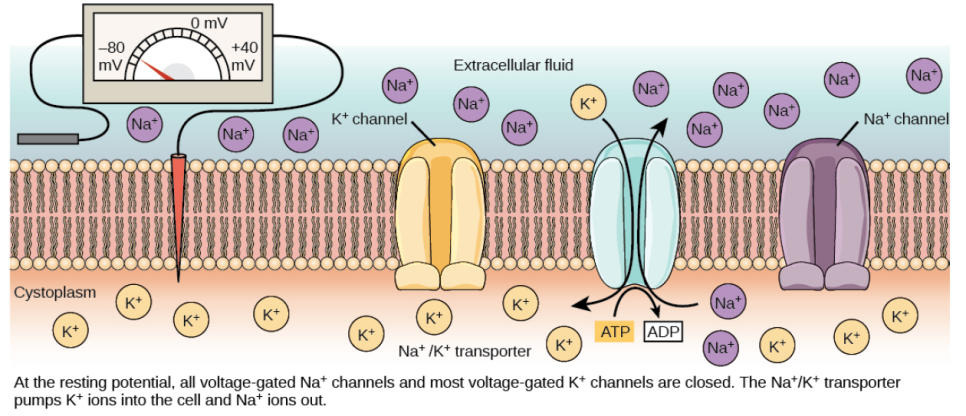 - 휴지전위에서 전압 개폐형 소듐 채널과 포타슘 채널은 닫겨 있다. 그러나 Na+/K+ 펌프는 생물학적 에너지인 ATP를 사용하여, K+은 세포 내로, Na+은 세포 외로 이동시킨다.