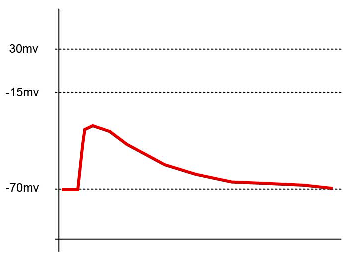 - 급격한 소듐 이온의 유입으로 활동전위가 발생하고, 최대 탈분극 전위는 약 +40mV에 달한다.