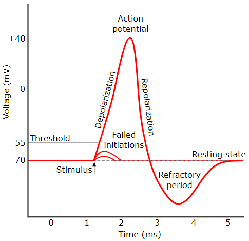 - 세포체의 내부전위가 높아져, 축색 언덕(axon hill)에서의 국소전위(local potential)들이 역치(threshold) 수준을 넘어서면,