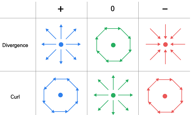필드는 발산과 회전의 유형 및 부호에 따라 그 모양과 특성[그림 2]이 달라지는데, 이후 물리학적 현상을 확인하면서 자세히 살펴보도록 한다.