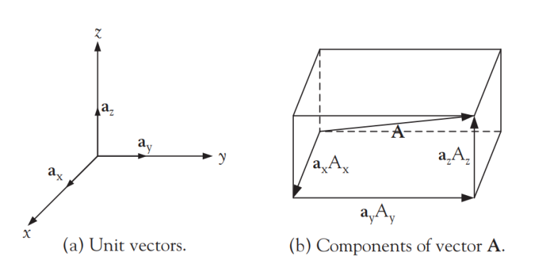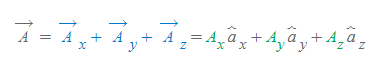 3차원 직각 좌표계에서 벡터 A의 성분벡터와 성분은 아래와 같이 정의된다.