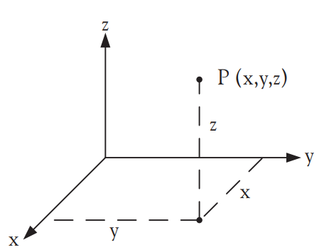 - 원점으로부터 각 축을 향해 뻗어나가는 정도를 x, y, z라고 하면, 점 P는 P(x, y, z)[그림 2]로 표현된다.
