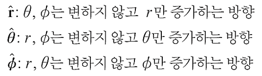 원통좌표계의 각각의 좌표에 대한 단위벡터는 다음과 같다.