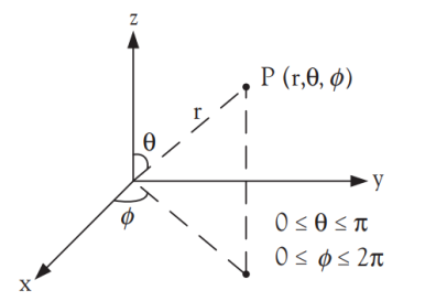- φ: 방위각(azimuth angle), +x축으로부터 반시계 방향의 각도