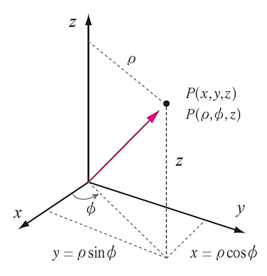 3차원의 좌표 시스템에 놓인 점 P는 직각 좌표계와 원통 좌표계 모두의 좌표값으로 표현될 수 있으며, 이들은 서로 변환되어 계산될 수 있다.