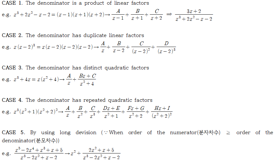 부분분수의 분해는 분모의 형태에 따라 크게 5가지 풀이법을 갖는다.