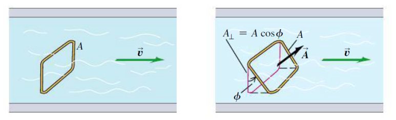 - 그러나 만약 면 A의 표면적에 대해 유체가 각 θ를 가지고 비스듬히 흐르면, 같은 시간 당 총 흐른 부피는 평행할 때 보다 그 양이 적어지게 된다.