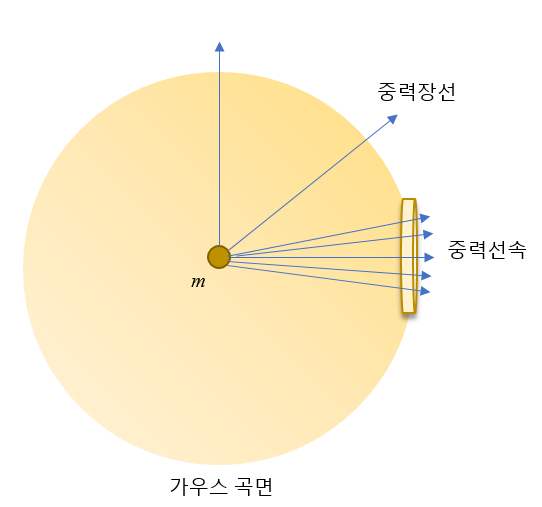 [그림 2]와 같이 가우스 면을 지나는 알짜 중력 선속과 닫힌곡면 내의 원천질량 사이의 관계를 알아보자.