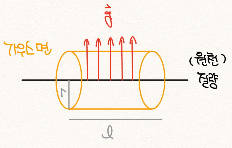 - 가우스 면의 설정: 평면에 수직인 축을 가지고 각각의 넓이가 A인 평면을 관통한 원통으로 곡면을 설정한다.