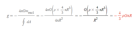 한편 구 내부에서의 임의의 한 점에 대한 중력장 크기도 구할 수 있다.