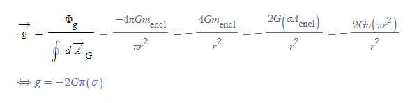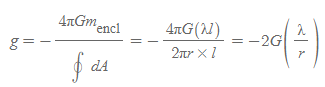 - 의미: 선대칭 질량분포의 경우, 중력장의 크기는 선질량 밀도에 비례하고, 떨어진 거리에는 반비례한다.