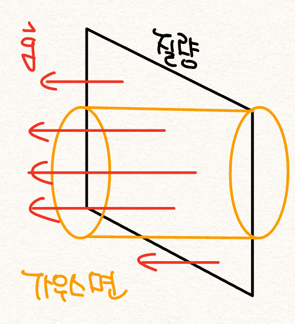 - 무한평면에 대한 가우스 원통은 2개의 원넓이(πr^2)로 구성되어 있으나 무한 평면의 중력장 크기는 [그림 5]와 같이 가우스 곡면 평면을 '뚫지 않은' 가우스 원통을 가정한다.