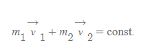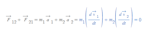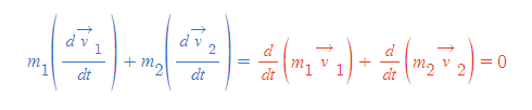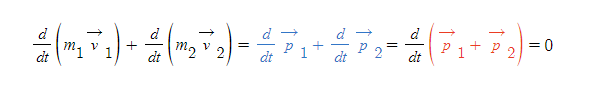 - m(벡터 v)의 시간에 대한 도함수가 0이므로, 두 mv의 합은 상수여야 한다. ⇒ 고립된 입자계에서 각 입자에 대한 m(벡터 v)의 합이 보존된다.