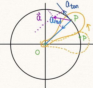 [그림 4]와 같이 주황색의 강체가 회전할 때 한 점 P에서의 병진 가속도 및 구심 가속도 사이의 관계를 알아보자.