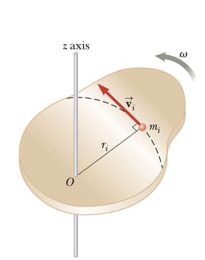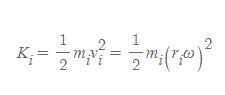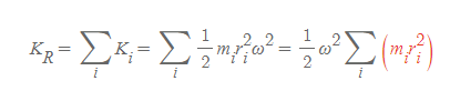 - 호의 길이공식을 대입한 접선 속력 v = rω이고, 이를 적용한 강체의 미시입자 i가 갖는 회전운동에너지는 다음과 같이 정의할 수 있다.