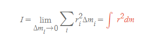 연속적 입자계: 어떤 강체가 연속적일 때 관성모멘트의 계산은, 각각의 질량이 Δm_i인 수많은 작은 요소들이 이루어졌다고 가정할 수 있고, 이를 적분하여 구할 수 있다.