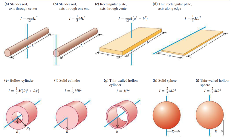 그림 2. 다양한 모양의 강체 관성모멘트 [출처: Sears & Zemansky's University Physics with Modern Physics, Young & Freedman, 14th ed., 2016, p.310]