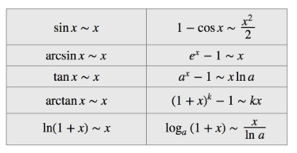 특히 두 개의 무한소 비(ratio of two infinitesimals as x→0 or a)의 극한을 계산할 때, 아래의 표는 극한의 계산을 더 쉽게 만들어 준다.