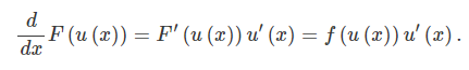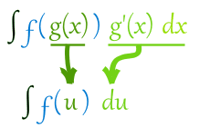 만약 u=g(x)가 구간 I를 치역으로 갖는 미분가능함수이고, f가 I위에서 연속이면 다음과 같다.