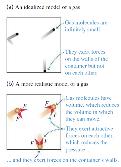 [2] 실제 기체는 (1)분자 자체의 부피와 함께 (2)분자 간의 상호작용이 존재하고, 분자 간의 상호작용은 대부분 분자간의 인력에 의한 것이다. ⇒ 실제 기체의 압력은 분자 간의 인력 요소로 이상기체에서 예상되는 압력보다 작게 측정된다.
