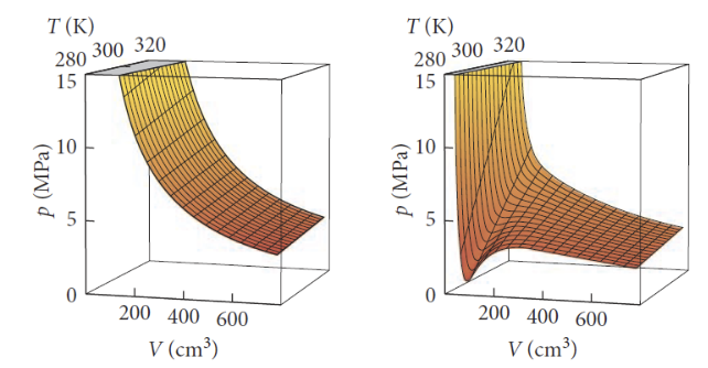 그림 3. 이상기체 상태방정식을 만족하는 3차원 그래프와 반데르발스 방정식을 만족하는 기체의 3차원 그래프