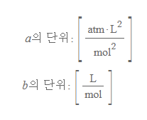 - b: 부피보정상수, 기체에 따라 다른 크기를 갖는 상수로, 1몰의 분자들이 차지하는 기체 자체의 부피로