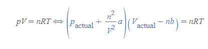 [3] 기체의 감소되는 압력 p_d는 (1)이상기체가 차지할 수 있는 부피 V_actual의 제곱에 반비례하고, (2)기체의 몰수에는 제곱비례한다. → 비례상수(압력보정상수) a를 도입해 비례식을 항등식으로 만들 수 있다.
