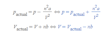 - a: 압력보정상수, 기체에 따라 다른 크기를 갖는 상수로, 분자들 사이의 인력 때문에 발생하는 실제 기체의 낮은 압력을 반영