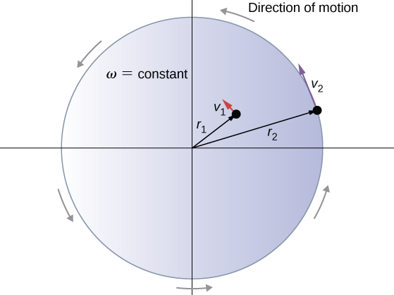 [그림 3]과 같은 원판 강체에 요소 1과 2를 설정하였을 때, 각속도 ω는 지점에 상관없이 모두 일정(constant)하다. 그러나 반지름이 큰 지점(1<2)의 요소가 접선속력 수식에 따라 더 큰 접선속력을 가짐을 알 수 있다.