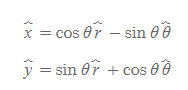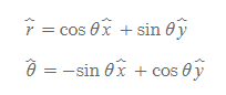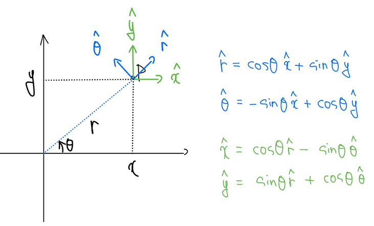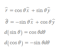 [그림 5]와 같이 평면 상에서 직각좌표계와 극좌표계의 단위벡터는 서로 상대의 단위벡터로 계산이 가능하다.