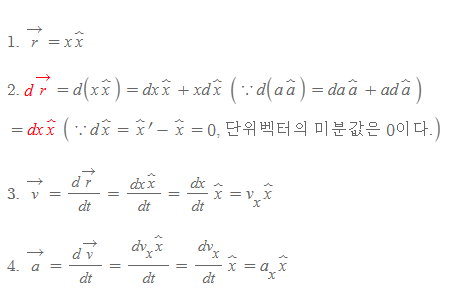 1차원의 직선 좌표계에서 (1)위치벡터, (2)변위벡터, (3)속도벡터, (4)가속도벡터를 구해보자. x축의 1차원을 가정하면 각각의 값은 아래와 같다.