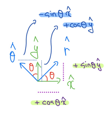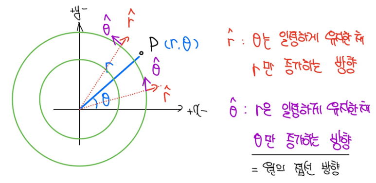 - hat θ: r은 일정하게 유지한 채 θ만 증가하는 방향(원의 접선방향)을 갖는 단위벡터