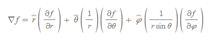 위에서 살펴본 gradient의 기본식은 직교좌표계에서 유효하다. 그러나 ∇값은 원통좌표계와 구좌표계에서 아래와 같이 변한다.