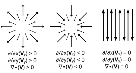 - 직교좌표계에서 divergence는 임의의 한 점(x, y, z)에 있는 공간 내에 벡터장이 퍼지는 지 아니면 모여서 사라지는 지를 나타낸다. ⇒ 벡터장이 사방으로 뻗어나가면 0보다 큰 값, 벡터장이 사방에서 어느 한 지점으로 빨려들어간다면 0보다 작은 값, 마지막으로 들어오는 양과 나가는 양이 동일하면 0이다.