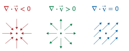 벡터미적분의 divergence 개념은 물리학의 전반에서 system의 한 지점으로부터 벡터장이 퍼지는 지(발산) 아니면 모여서 사라지는 지(수렴)를 보여주는[그림 1] 중요한 물리량이다.