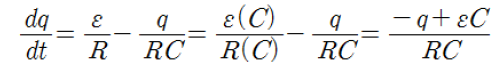 저항기 항의 전류 I을 dq/dt로 변환한 뒤, 위 식을 아래와 같이 변형한다.