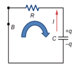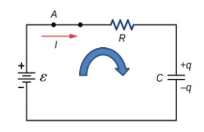 저항 R과 축전기 C는 전지로부터 나오는 기전력을 소비하고 충전하는 형태로 이용(-)하기 떄문에, 키르히호프의 법칙을 적용하여 아래와 같이 식을 쓸 수 있다.