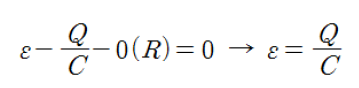 전지 기전력이 축전기에 최대 전위차를 생성한 것이고 이를 RC회로의 최대 전하충전량 Q로 정리하면 아래와 같다.