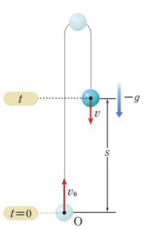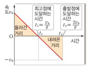 [그림 4]와 같이 물체를 위로 던졌을 때, 원점 O를 기준으로 위쪽을 (+)방향으로 잡는다. 그러면 처음 속도 v_0는 (+)의 값을 갖고, 중력가속도 g는 (-)의 값을 갖는다.