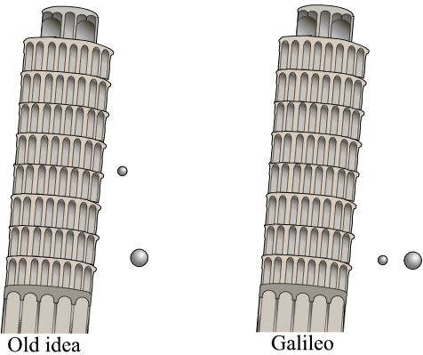 이탈리아의 천문학자 갈릴레이(Galileo Galilei, 1564-1642)는 자신이 고안한 실험[그림 1]을 통해 공기의 저항이 없는 조건에서 지표면 부근의 모든 물체는 질량과 관계없이 동등한 중력가속도를 갖는다고 생각했다. 지구의 중력에 의해 물체는 일정한 높이에서 중력가속도라는 등가속도를 가지며, 중력가속도의 방향은 항상 지구 중심부를 향한다.