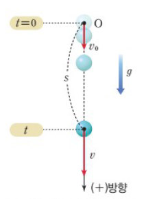 [그림 6]와 같이 물체를 아래로 던졌을 때, 원점 O를 기준으로 아래쪽을 (+)방향으로 잡는다. 그러면 처음 속도 v_0는 (+)의 값을 갖고, 중력가속도 g또한 (+)의 값을 갖는다.
