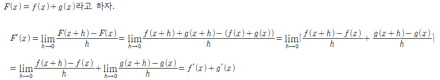 - (f+g)의 미분 값은 (f의 미분 값) + (g의 미분 값)과 같다.